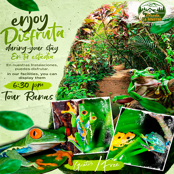 Adéntrate en nuestro sendero privado, un rincón escondido en medio del bosque donde la naturaleza cobra vida al caer la tarde. En este recorrido guiado, podrás observar diversas especies de ranas en su hábitat natural, disfrutando de sus colores vibrantes, cantos únicos y fascinantes comportamientos.